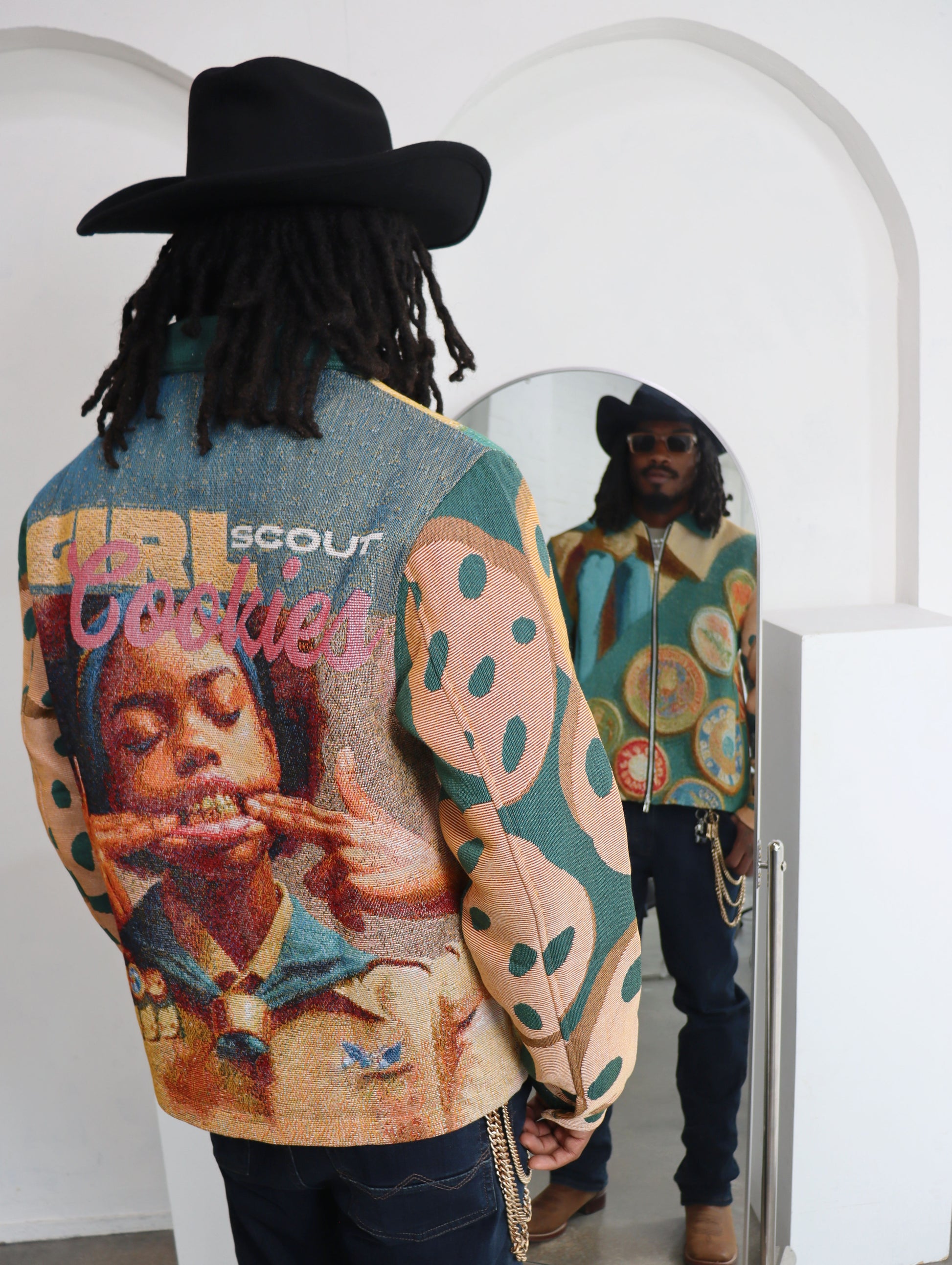 (MENS) GIRL SCOUT COOKIES HANDMADE TAPESTRY JACQUARD ZIPPERED JACKET
