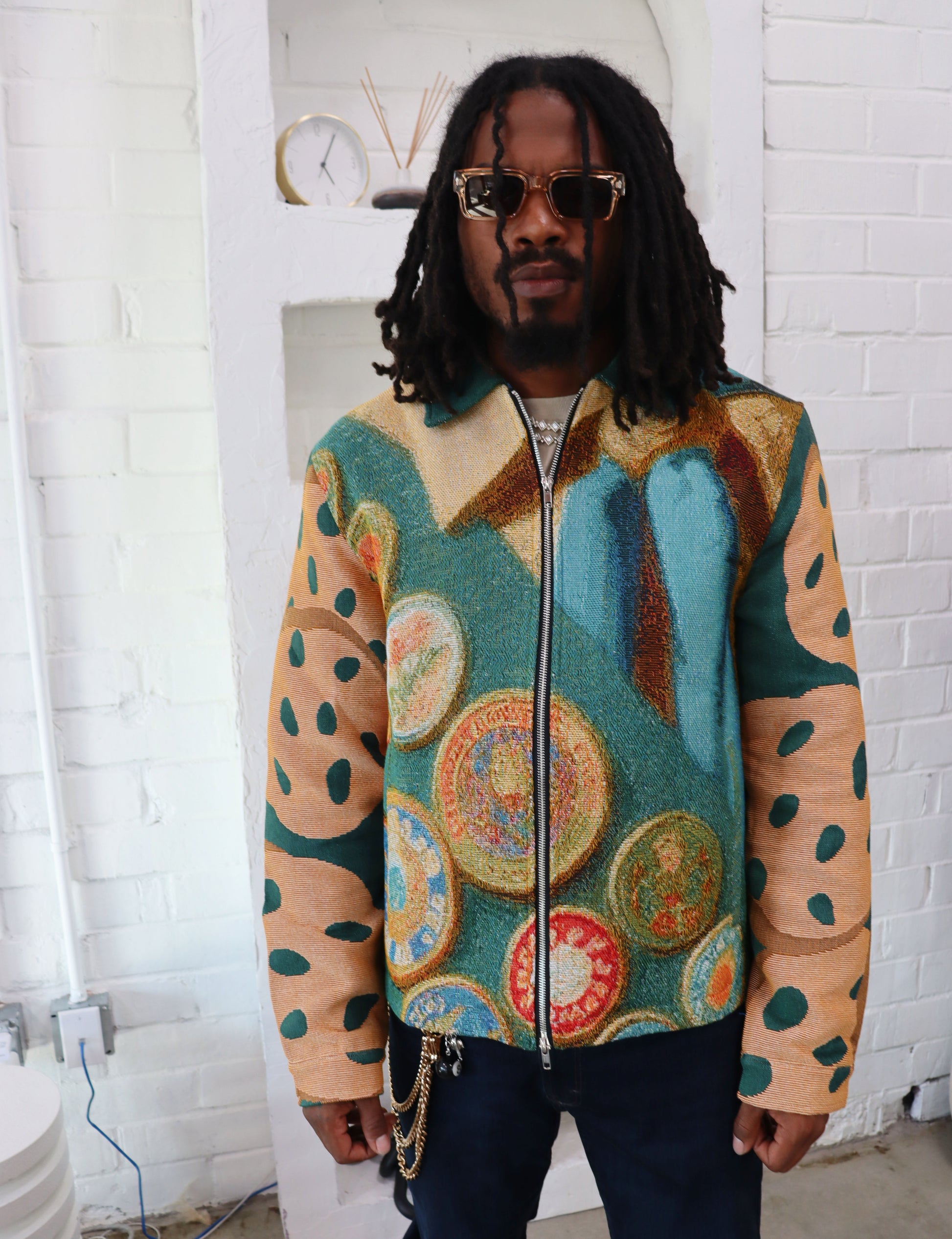 High quality Handmade Tapestry Jacquard Zippered Jacket. Hand stitched, woven jacquard material,Bold solid colors. One of a kind pc. Only 65pcs made.